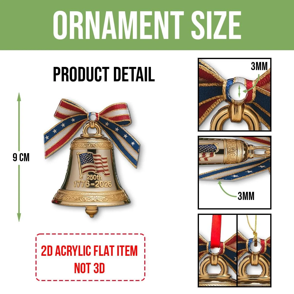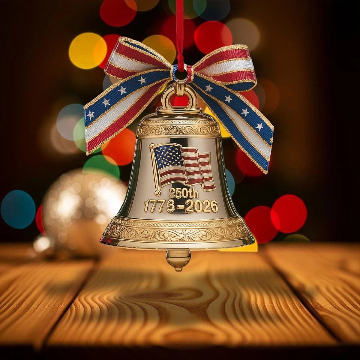 American Liberty Bell Ornament – 250th Anniversary Decoration – Gold Patriotic Christmas Bell With US Flag Bow 1776–2026 USA Gift
