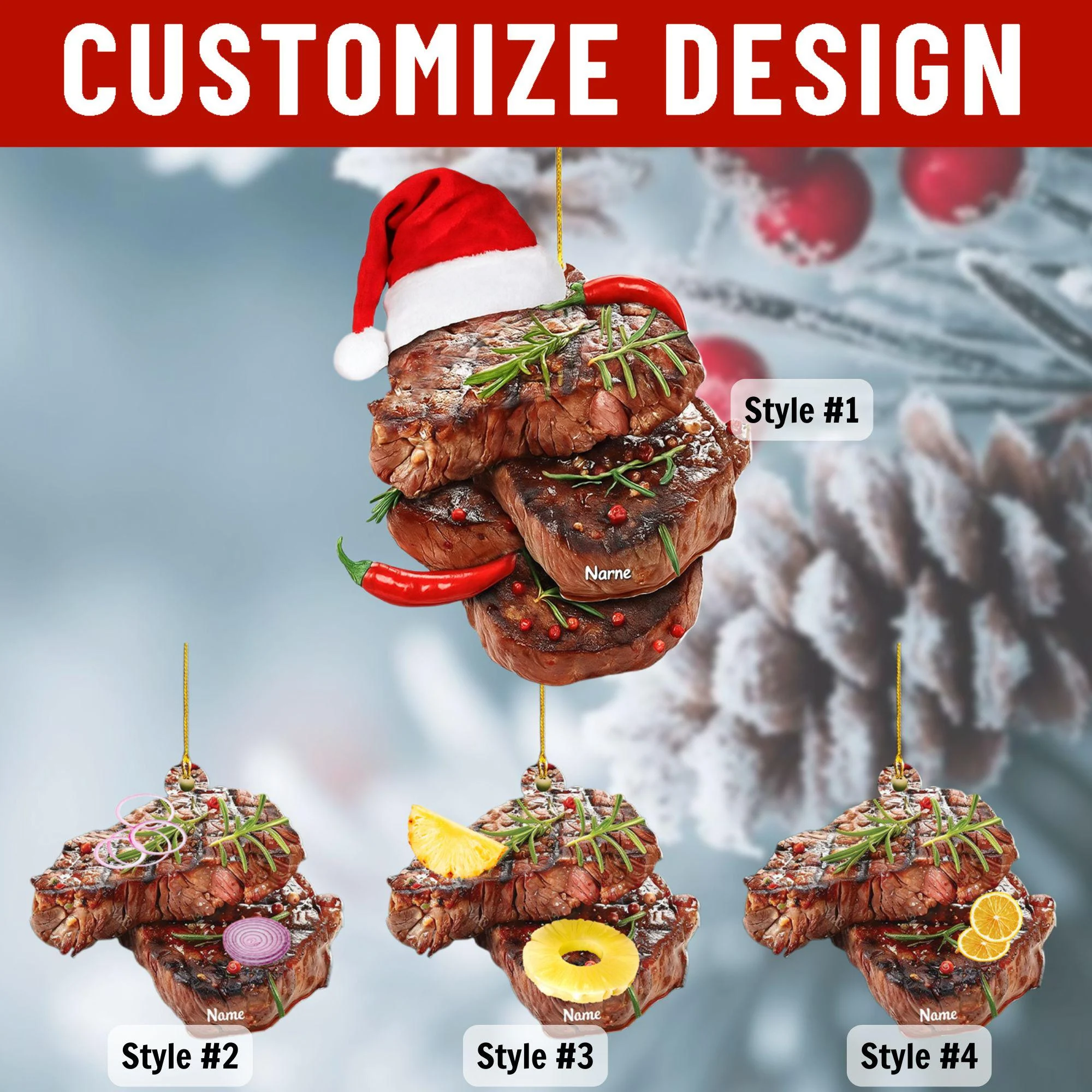 Add a savory twist to your holiday decor with our Personalized Steak Ornament. This unique decoration features customizable steak designs with options like chili (Style #1), onion (Style #2), pineapple (Style #3), or orange slices (Style #4), topped with a Santa hat, making it a fun keepsake for food lovers.